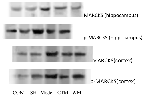 The MARCKS and p-MARCKS protein expression were surveyed by western blot technic. In hippocampus and contex, MARCKS and p-MARCKS protein were expressed in model group vs. other groups (P<0. 01), in hippocampus CTM group vs. western medicine (WM) group (P>0.05), in contex CTM group vs. WM group (P<0.01) (Figure 4).