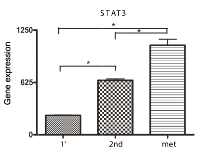 Furthermore, STAT3 expression was statistically significant increased in serially transplanted tumor tissue relative to expression in the original tumor (Figure 6). In addition, a statistical significant increase in STAT3 expression was found in lung metastasis as compared to the original tumor, as well as in the serially transplanted flank tumor.