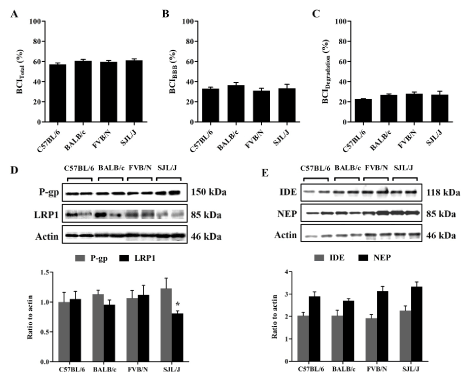 Figure 1. 125I-Aβ40 clearance from the brain of C57BL/6, BALB/c, FVB/N and SJL/J wild-type mice. Total 125I-Aβ40 brain clearance (BCITotal(%)) (A), BBB 125I-Aβ40 clearance (BCIBBB(%)) (B) and clearance of 125I-Aβ40 by brain degradation (BCIDegradation(%)) (C) from the brain of C57BL/6, BALB/c, FVB/N and SJL/J wild-type mice. (D) Representative western blot and densitometry analysis of P-gp, LRP1 and protein loading control (GAPDH) in the brain tissue of C57BL/6, BALB/c, FVB/N and SJL/J wild-type mice. (E) Representative western blot and quantitative fold change for IDE, NEP and protein loading control (GAPDH) in the brain tissue of C57BL/6, BALB/c, FVB/N and SJL/J wild-type mice. The data are expressed as mean ± SEM of n = 4 mice; * p<0.05 and ns is not significant.