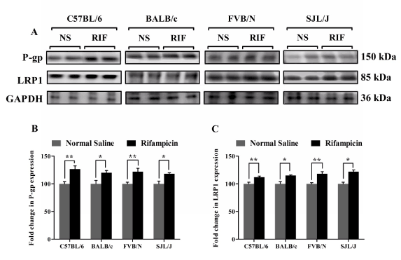 Figure 3. Rifampicin enhances P-gp and LRP1 expression in the brain microvessels of C57BL/6, BALB/c, FVB/N and SJL/J wild-type mice. Western blot analysis showed significantly higher expression level of P-gp and LRP1 in brain microvessels of rifampicin treated mice compared to normal saline treated mice. (A) Representative western blot lanes for P-gp, LRP1 and protein loading control (GAPDH). (B) Quantitative fold increase in P-gp and (C) LRP1 expression in the brain microvessels of C57BL/6, BALB/c, FVB/N and SJL/J wild-type mice after normal saline or rifampicin treatment. The data are expressed as mean ± SEM of n=3 independent experiments from n=4 mice; * p<0.05 and ** p<0.01.