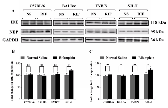 Figure 4. Effect of rifampicin on IDE and NEP expression in the brain tissue of C57BL/6, BALB/c, FVB/N and SJL/J wild-type mice. Western blot analysis showed significantly higher expression of IDE and NEP only in the brain tissue of SJL/J mice after treatment with rifampicin. (A) Representative western blot lanes for IDE, NEP and protein loading control (GAPDH). (B) Quantitative fold change in IDE and (C) NEP expressions in the brain tissue of C57BL/6, BALB/c, FVB/N and SJL/J wild-type mice after normal saline or rifampicin treatment. The data are expressed as mean ± SEM of n=3 independent experiments of n=4 mice; * p<0.05 and ns is not significant.