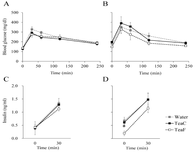 Figure 1. Effects of tea infusion on glucose tolerance and insulin response in NSY mice. Glucose tolerance tests (GTTs) were performed at 8 (A, C) or 12 (B, D) weeks of age. Blood glucose concentration (A, B) and plasma insulin (C, D) were measured during GTTs. All values are mean ± SEM (n = 4 or 5).*p< 0.05; significantly different from the Water group at each time-point, determined by one-way ANOVA, followed by Scheffé's test.