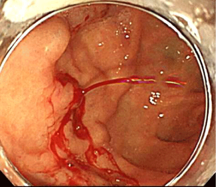 Figure 1. Spurting gastric variceal bleeding during emergency endoscopic examination.
