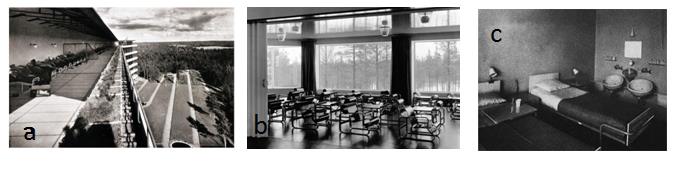 Figure 3. The importance of architecture as a “Medical Instrument” was pioneered by Finnish architect Alvar Aalto, when in 1929 he designed the UNESCO world heritage Tuberculosis Sanatorium in Paimio, at deep contact with nature (a) creating specific ergonomic chairs for patients (b) and patient-tailored rooms (c) Bedrooms held two patients, each with his or her own cupboard and washbasin (see here special noiseless non-splash basins). Since the patients spent many hours lying down, Aalto placed the lamps in the room out of the patients' line of vision and painted the ceiling a relaxing dark green so as to avoid glare.