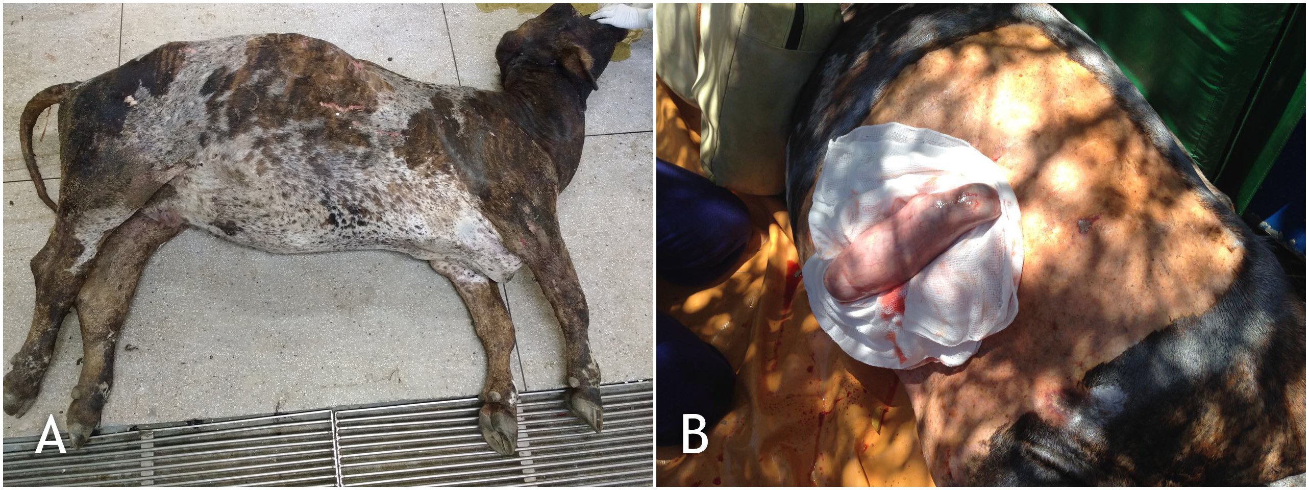 The four-year-old crossbreed mini-cow with a pass 24 hour-long sternal decubitus, presented a brick red ocular mucous, scar in mandibular commissure and absence of incisive teeth, dehydration, ectoparasites presence and temperature of 103,1ºF (Figure 1A). During rectal palpation a late pregnancy was detected and ultrasonography exam confirmed the presence of a live fetus. One day after the arrival of the cow it was noticed the elimination of mucous vaginal plug. A new rectal palpation showed maternal-fetal distortion, leading to an emergency caesarean (Figure 1B). Even though the calf was on term it came to death minutes after birth. The cow was submitted to antibiotic and anti-inflammatory therapy but showed no positive results and stayed in lateral decubitus until its death four days after surgery.