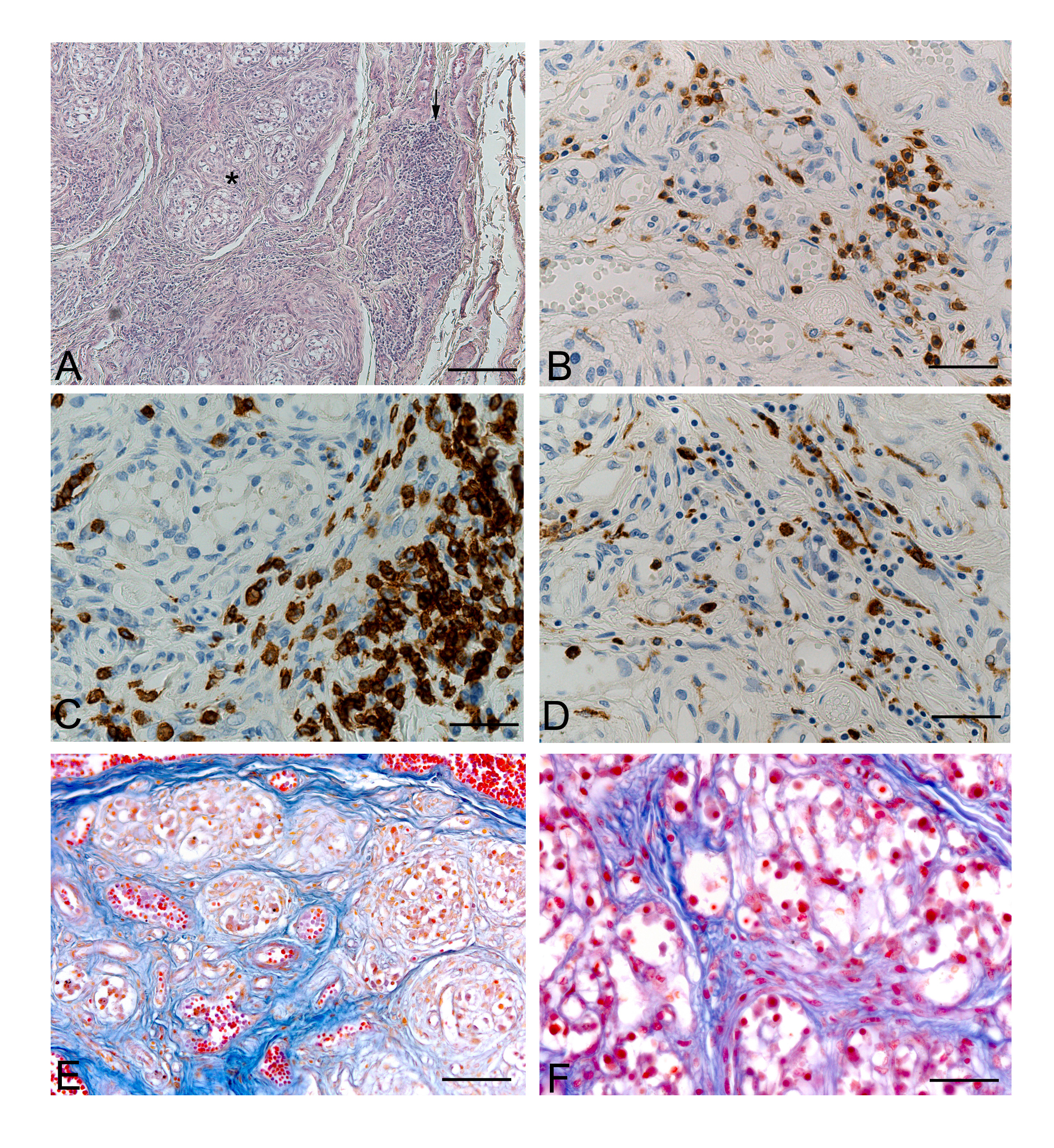 Figure 2. Carotid bodies of opiate-related deaths. A: Chronic carotid glomitis, characterised by an inflammatory aggregate (arrow) partially infiltrating a glomic lobule (star) (H.E.). B-D: Carotid body sections immunohistochemically stained with anti-CD45 (B), -CD8 (C), and -CD68 (D), showing inflammatory aggregates mainly composed of CD8-positive cytotoxic lymphocytes with macrophagic component. E-F: Increased interlobular and intralobular connective components of carotid bodies of opiate-related deaths. (Scale bars: A: 150 mm; B-D, F: 37.5 mm; E: 75 mm).
