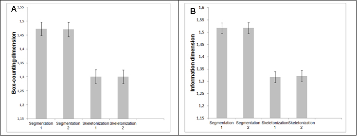 The first step to make the statistical analysis of fractal dimensions of the two groups was to test whether the segmentations represented the original images of the retinasaccurately. We selected ten segmented images of the DRIVE made by one observer, carried outtheskeletonization for the control group and compared it to the skeletonization of the same ten images segmented manually by another observer. Figure 3 represents the box-counting dimensions (3A) and information (3B) to segmented and skeletonized images, respectively;t-student test showed that for both observers there were no significant differenceneither between the segmented images (p=0.82for box-counting dimension and p=1.0for information dimension) northe skeletonized ones (p=1.0for box-counting dimension and p=0.68for information dimension). These results showed that the manual segmentation is a reliable method and can be considered as gold standard. Table 2 shows the fractal dimensions (box-counting dimension and information) of the control group and NPDR.  In this case, neither the whole retina nor its different regions in the control group displayed difference to the NPDR group (p>0.05).