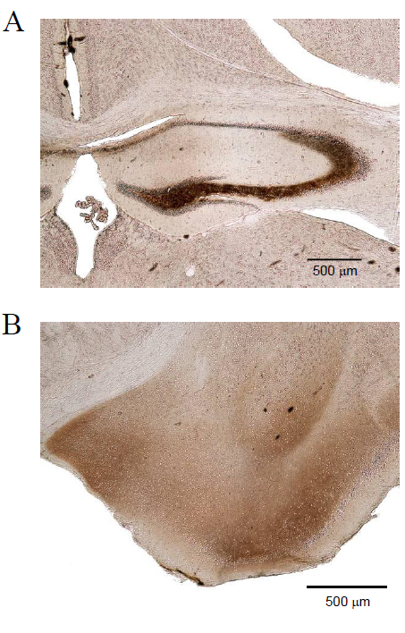 Figure 2. Distribution of Zn2+ in the normal mouse brain. TIMM staining of a coronal cryosection of a mouse brain (C57BL/6). Note that Zn2+ accumulations are predominantly localized in the hippocampus (A), amygdala (B), striatum and cortex. Hp, hippocampus, CA, cornu ammonis, DG, dentate gyrus, bar: 500 μM.