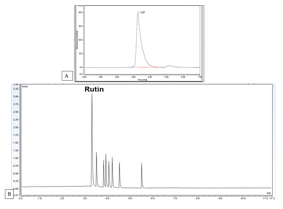 Preparation of standard and sample solutions for HPLC: Standard solutions of rutin were prepared in methanol of HPLC grade at a concentration range of 0.01625 to 1 mg/ml for rutin. The plant extract samples were dissolved in methanol HPLC at concentration 1 mg/ml then filtered through a 0.22 μm Chrom tech® Nylon syringe filter (Millipore). Triplicate injections were made and a linear regression was generated at wavelength of 257 nm.