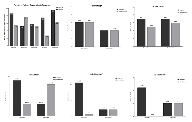 Biologics in general were found to be significantly more effective in patients that are HLA-Cw6 positive (OR=4.427, p=0.0005). Of the five biologic treatments tested, infliximab, ustekinumab, and efalizumab demonstrated significant differences in efficacy between HLA-Cw6 positive and negative patients (p=0.0391, p=0.0112, and p=0.0124, respectively): The efficacies of all three biologics were significantly higher in HLA-Cw6 patients (OR= 8, OR=21, OR=23). There was no significance difference in symptom resolution between HLA-Cw6 positive and negative patients treated with etanercept or adalimumab (OR=1, p=1.0000; OR=1.2, p=1.0000, respectively).