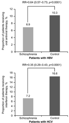 The results of this study indicate that, in Taiwan, the prevalence of HBV (3.5% vs. 2.5%) and HCV (1.9% versus 0.9%) infection is significantly higher among patients with schizophrenia versus those without schizophrenia. The low prevalence rates of HBV infection observed in the general population (2.5%) may be attributed to the inclusion of the post-vaccination age group of <30 years in our dataset. Due to the universal HBV vaccination policy, this age group has a greater probability of being vaccinated as compared to the other age groups. The results also show that patients with schizophrenia have a significantly higher risk for having HBV and HCV infections than the general population. The subgroup analysis shows a reduced risk of comorbid HBV or HCV infections in schizophrenia patients with increasing age. The higher prevalence of hepatitis infections with age reiterates the effectiveness of the vaccination program; however, the high RRs in the younger age group emphasize the need for ensuring successful implementation of vaccination through the entire population. Further, healthcare utilization (routine antiviral monitoring and antiviral treatment) was lower among schizophrenia patients with comorbid HBV or HCV infections versus the non-schizophrenia controls.