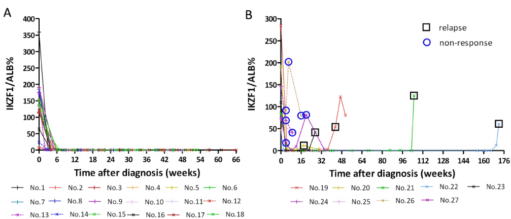 Of the entirety, 36.3% [31.1-41.7%] showed IKZF1-deletion, including 66 (68.8%) with BCR/ABL while 46 (22.4%) without. In 119 IKZF1-deletion positive specimens, the average IKZF1-deletion copies/ALB copy was 138.5% (0.1%-697.9%). The result of distribution for IKZF1-deletion levels in patients with ALL was shown in Table 3. Of 96(80.7%) patients hold higher levels of IKZF1-deletion (12.5%-697.9%),which might be a helpful condition for MRD assay based the IKZF1-deletion.27 IKZF1-deletion-positive patients (219 samples in total) were followed up after treatment, among them, 18 patients in hematologic remission continued to test negative for IKZF1-deletion within 8-66 weeks of follow-up (Figure 3: A). Elevated levels of IKZF1 deletion were detected in five cases when relapse occurred. In four non responders, IKZF1 deletion maintained at high level (Figure 3: B).