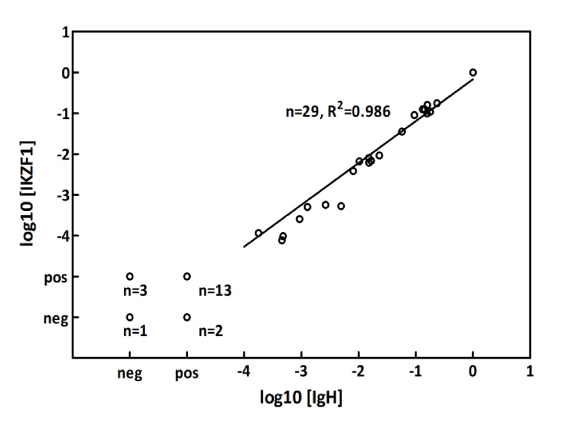 MRD analysis was subsequently performed on 54 paired samples and compared with MRD results obtained using IgH markers (Figure 2). A very good correlation (R2 = 0.986, P<0.01) was observed for the quantifiable paired samples. The results, as previously shown by others for IKZF1 Δ4-7 [18-19], confirm the good accuracy of MRD quantification using IKZF1 markers. They examined reproducibility measurement of MRD using markers based on IKZF1 deletions compared with Ig/TCR rearrangements and found that the IKZF1 results were as close to the Ig/TCR results. It is therefore likely that this IKZF1 marker will be at least as stable as Ig/TCR rearrangements, although this will need to be confirmed in more extensive studies. Two DNA MRD markers with high sensitivity (at least 10-4) are generally required in MRD intervention clinical trials [29-30], and in a large cohort of 2854 pediatric precursor B-cell ALL patients, 20% of patients had only one sensitive marker and 8% had none [30]. At present the concept of using disease-related markers for MRD testing has been already established for fusion transcripts such as BCR-ABL and for gene rearrangements such as for SIL-TAL1 in T-ALL and for MLL rearrangements in infant ALLs [31]. The use of oncogenic lesions for MRD monitoring has been limited by the fact that recurrent chromosomal translocations are not found in all ALL and are usually studied at the RNA level, so that IKZF1 gene deletions will provide a useful addition to the repertoire of MRD markers currently available for monitoring MRD in ALL and inclusion of this marker in standard screening for MRD targets would be an easy way to provide more patients with two sensitive markers.
