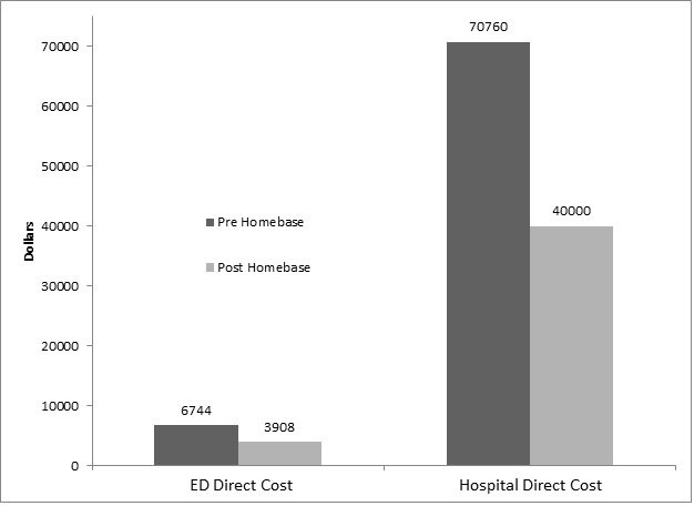 Figure 2. Average direct ED and admission cost per patient 12 months before and 12 months after Homebase enrollment
