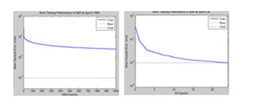 In Figure 10A, it can be noticed that the performance can’t match the goal (0.02) due to the selective layer and training (learning) functions which are 'tansig', 'purelin', 'traingd' respectively. In contrast, the performance is very good and matchs the goal at the 24th epoch when we use 'tansig','logsig','trainscg' functions in Figure 10B, while it spends 1000 epochs in Figure 10A with lower performance.