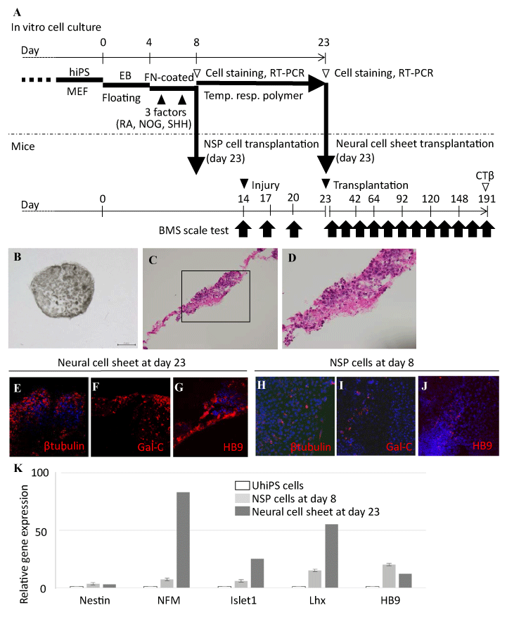 A. A schematic representation of neural cell sheet formation and the transplantation. Undifferentiated hiPS cells were maintained in a growth medium on a feeder layer consisting of mouse embryonic fibroblasts (MEF). We developed embryoid body (EB) from undifferentiated hiPS cells in a floating condition (Floating) for 4 days. Then the cells were cultured in fibronectin (FN)-coated dishes for 4 days. We introduced retinoic acid (RA), noggin (NOG), and sonic hedgehog (SHH) (3 factors) into the culture twice (at day 5 and day 7). The neural stem/progenitor (NSP) cells were disaggregated into single cell suspensions at day 8. The NSP cells at day 8 were utilized for NSP cell transplantation, immunocytochemistry, and RT-PCR. An aliquot of the cells was cultured to lead the formation of neural cell sheets on temperature-responsive gelation polymer (temp. resp. polymer) coated dishes (Upcell®) for 12 to 16 days, depending on the neural maturation. The neural cell sheets were recovered by lowering temperature of the culture dishes below 22°C, and were used for transplantation. We conducted open-field Basso Mouse Scale (BMS) scoring on the first day, third day, and once every two weeks after injury up to day 191. Spinal cord tissues were obtained from SCI mice for histological analysis at day 191.
