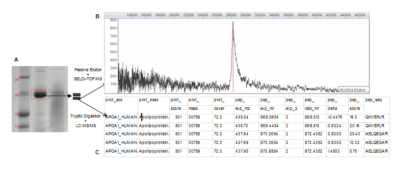 Following passive elution, the remaining half of the 28 kDa band was tryptically digested and generated peptide mixture analysed by LC-MS/MS. A MASCOT search of derived peptide masses in the SwissProt protein database produced a high probability identification of this protein as APOA1 (Figure 2C). MS analysis of the 28 kDa gel band identified 2 additional proteins. This was observed when identifying other biomarkers. This is a common limitation of 1D gel electrophoresis as it cannot always separate all proteins. Although unlikely based on the overall protein score, the presence of these two proteins in the 28 kDa gel band cannot be disputed. However, the presence of a single 28 kDa peak in the passive elution spectra and the immunodepletion of this peak with a specific antibody (explained below) strongly suggest that the 28 kDa gel band contains the APOA1 biomarker.