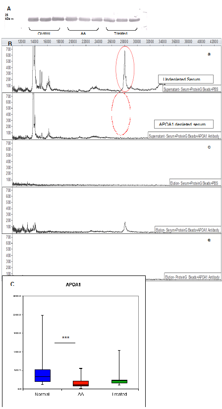 Diagnostic accuracy of the identified biomarker was assessed by measuring its serum levels by ELISA. The APOA1 concentration in AA sera differed significantly from control sera (AA mean=1642.2 ± 201.9 SEM μg/ml, control mean=3962.8 ± 618.8 SEM μg/ml; p=0.0001), verifying SELDI results and confirming APOA1 as a disease-associated biomarker (Figure 3C).