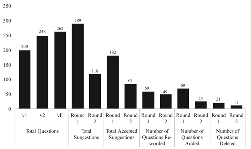 Figure 2. Summary comparison of the number of questions re-worded, added and deleted, and subsequent number of questions in version 1 (v1), version 2 (v2) and Final version (vF).