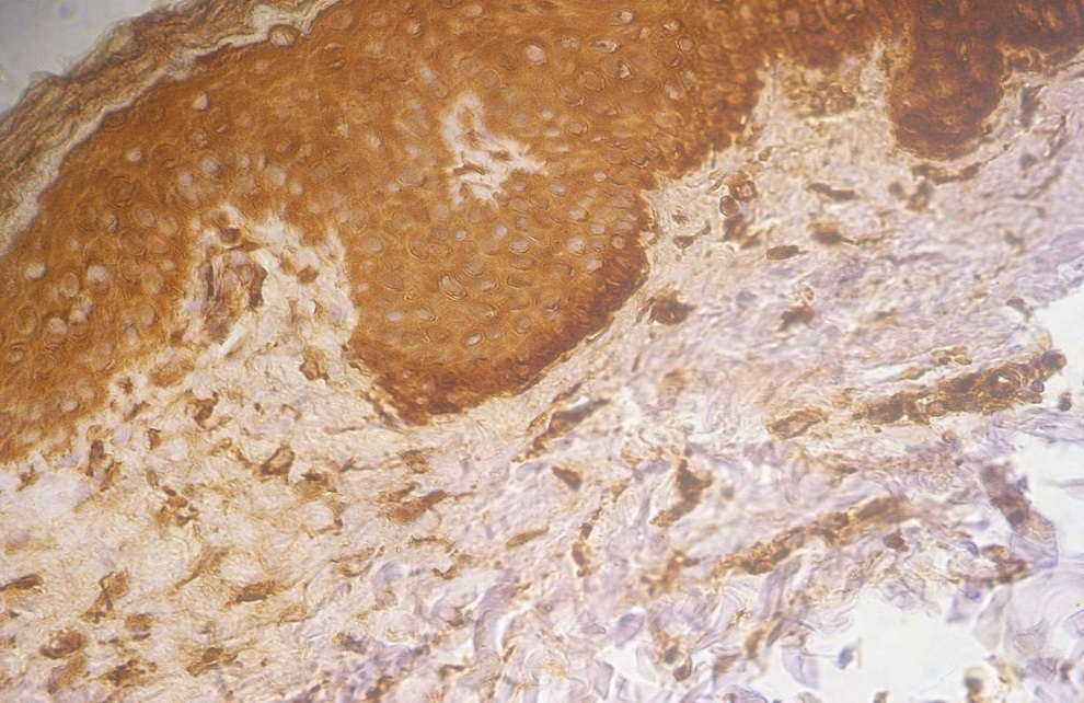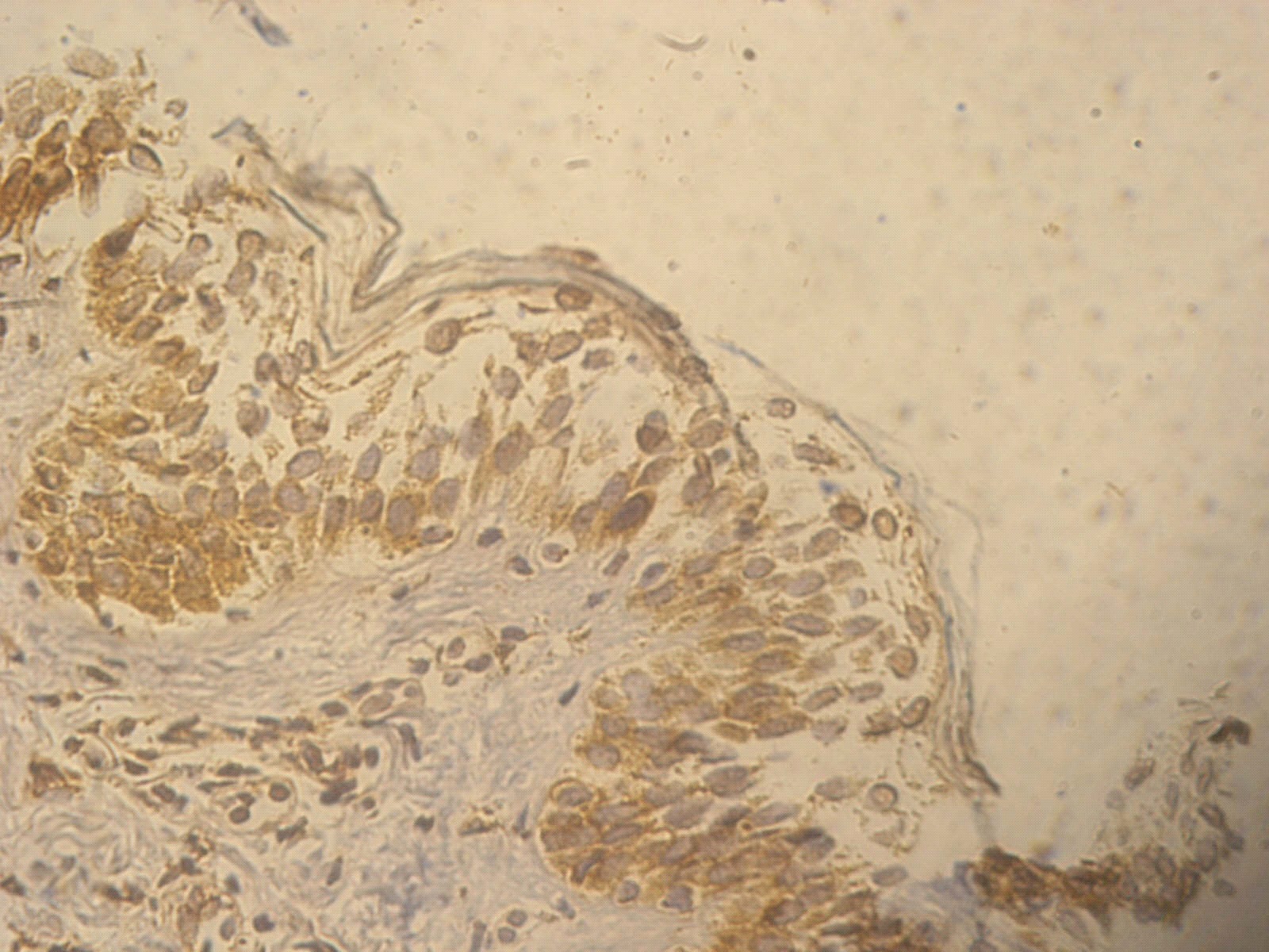 Immunostaining for PGP9.5 and ssDNA were applied for all skin specimens. Immunohistochemical staining was done using Labeled StreptAvidin Biotin (LSAB) method in which the enzyme-labelled streptavidin reacts with the biotinylated secondary antibody. A kit supplied from Dako® LSAB+System-HRP, Carpinteria, California, USA was used for the substrates in this method. Purified mouse monoclonal antibody to PGP9.5 (BIOCARE MEDICAL, LLC., PGP9.5, CM 329 AK, Concord, California , USA) was used as the primary antibody to detect PGP9.5 in the tissue sections. Purified mouth monoclonal antibody to ssDNA (Enzo life sciences, International, INC, ssDNA, mAb (F7-26)R, ALX-804-192R, Plymouth Meeting, Pennsylvania, USA) was used as the primary antibody to detect ssDNA in the tissue sections. Incubation of the sections in Streptavidin-HRP solution (Dako®, Carpinteria, California, USA) was done for one hour at room temperature. This was followed by rinsing in PBS twice for 3 minutes each. Substrate-Chromogen solution (Buffererd substrate-DAB Chromogen, Dako®, Carpinteria, California, USA) was applied and incubated with the tissue sections for 10 minutes. This was followed by rinsing in distilled water twice for 3 minutes. Counterstainning was done by placing the slides in a bath of hematoxylin for 2 minutes followed by rinse in distilled water for 2 minutes. Dehydration of the sections was done through 95% ethanol for 1 minute then 100% ethanol for 2 minutes. This was followed by clearance in xylene for 2 minutes. The sections were mounted and coverslipped. The sections became ready for examination. A light microscope (Olympus CX5Japan) was used to examine the tissue sections under different magnification.