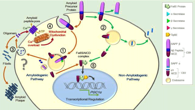 Figure 1. APP processing and its effect on mitochondrial biogenesis. In the amyloidogenic pathway (orange arrows), internalized APP on early endosomes gets sequentially cleaved by β-secretase, releasing the soluble extracellular domain of APP (sAPPβ), and then by the γ-secretase complex, which generates Aβ peptide and the APP intracellular carboxy-terminal domain (AICD) (1.1).By the other hand, during the non-amyloidogenic pathway (green arrows), a first cleavage by α-secretase prevents formation of Aβ, instead producing sAPPα and p3 peptide followed by a second cleavage by γ-secretase, producing AICD (1.2) Aβ peptide rapidly aggregates to form oligomers, protofibils and fibrils en route to the deposition of amyloid plaques (2.3). In its soluble oligomeric form (SOAβ), Aβ is able to disrupt the membrane by its insertion and formation of a non-specific pore-like structure that provokes calcium overload and ATP leakage, both impinging on mitochondrial function (2.4). AICD (generated in both pathways mentioned above), has been proposed to act as a transcriptional regulator through a mechanism involving interaction with the adaptor protein Fe65 and the action of Tip60, which could affect the PGC-1α gene expression –amongst others factors- having possible repercussions over mitochondrial function (2.5).