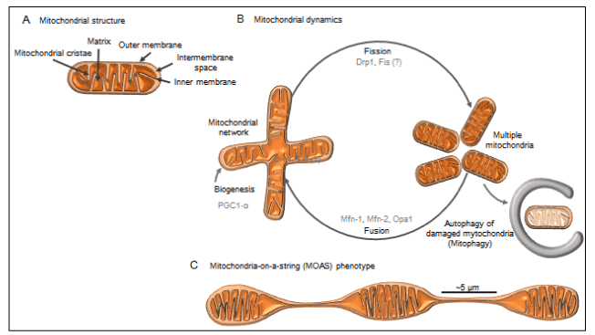 Figure 2. Mitochondrial structure and dynamics (2A). Mitochondrial structure, depicting its basic components: Outer and Inner mitochondrial membranes separated by an Intermembrane space, mitochondrial cristae, resulting from inner membrane invaginations and an interior matrix, containing the enzymes that are responsible for the citric acid cycle reactions. (2B). Mitochondrial dynamics are actively regulated processes designed to prevent cell damage and death through its multiple protective responses. PGC-1α–mediated mitochondrial biogenesis increases mitochondrial numbers and replaces damaged mitochondria. In addition, mitofusin-mediated fusion dilutes accumulated damage, including mitochondrial DNA mutations and oxidized proteins. When mitochondrial damage exceeds a critical level, Drp1-mediated asymmetric fission divides a mitochondrion into a larger, polarized healthy portion (which can reintegrate with the network) and a smaller depolarized, abnormal portion. This isolates the diseased mitochondria, allowing them to be packaged into autophagic vacuoles that are transported to lysosomes for elimination by mitophagy. Excessive fission causes cell death, whereas excessive mitophagy causes autophagic stress; both promote cell damage and death. (2C).Mitochondrial fission arrest phenotype that results in elongated interconnected organelles, “mitochondria-on-a-string” (MOAS), described by Zhang et al. [84] where multiple teardrop shaped mitochondria (~0.5 μm in diameter) were connected by thin double membranes extending up to 5 μm long. This unusual mitochondrial structure could be easily mistaken for multiple individual organelles if the membrane connections are missed.