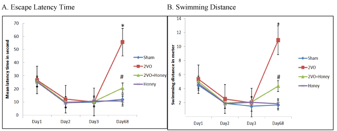 These results suggested that honey treatment can significantly affect the performance of chronic cerebral hypoperfused rats. It highlighted that all the rats in group A, B, C and D reached the hidden platform in reference memory test was not by chance. They learnt from extra maze cues to search for the hidden platform. As expected the performance of 2VO rats was worst on MWM as they had memory and learning impairment as a result of cerebral hypoperfusion induced by 2VO procedure.