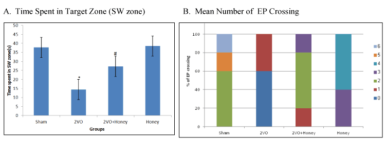 Time spent in target zone (SW zone): On Day 5, retention probe trial also showed that untreated 2VO rats spent less time in target zone than Sham rats (p<0.05) and 2VO+H (p<0.05). There was no significant difference between Sham and Honey treated group (p=0.999): Sham vs. 2VO+H (p=0.386) (Figure 6A).
