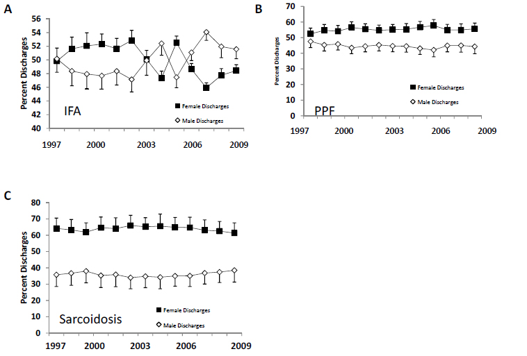 Figure 4. Percent hospitalizations based on gender A) Percent hospitalizations for IFA. B) Percent hospitalizations for PPF. C) Percent hospitalizations for sarcoidosis.