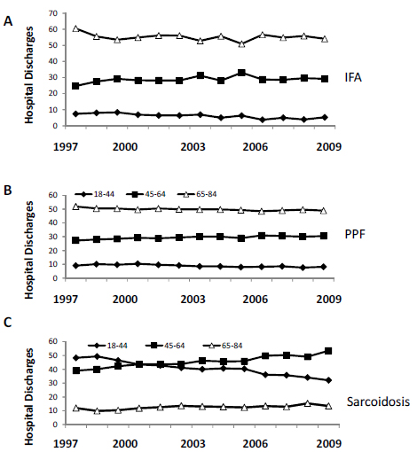 The HCUPnet Database provides access to national hospitalization data in the U.S. (1993-2008). We analyzed data related to ICD-9-CM codes for post inflammatory pulmonary fibrosis (PPF, ICD-9 code 515) and idiopathic fibrosing alveolitis (IFA, ICD-9 code 516.3) and compared them to those of sarcoidosis (ICD-9 code 135).