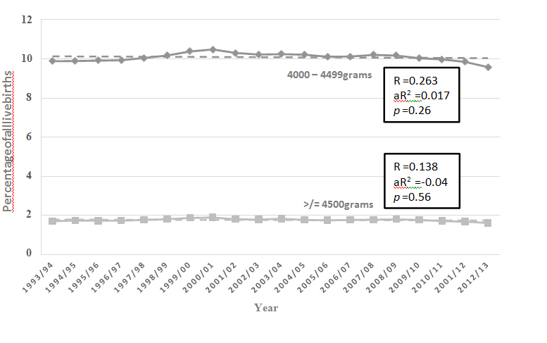 Figure2: Percentage of live born babies with a birthweight of 4000 to 4499 grams () and birthweight of 4500 grams or greater () in Australia during the period 1993 to2013.
