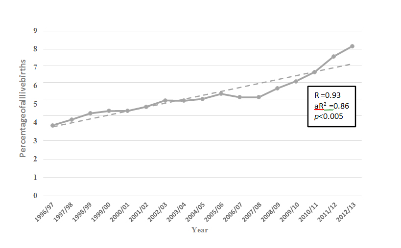 Figure3: The percentage of live born babies delivered by caesarean section in Australia during the period 1993 to2013.