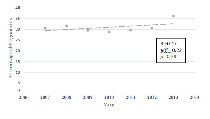 Figure6: The percentage of all pregnancies complicated by diabetes (pre-existing diabetes + gestational diabetes) where labour was induced in New South Wales during the period 2007 to2013.