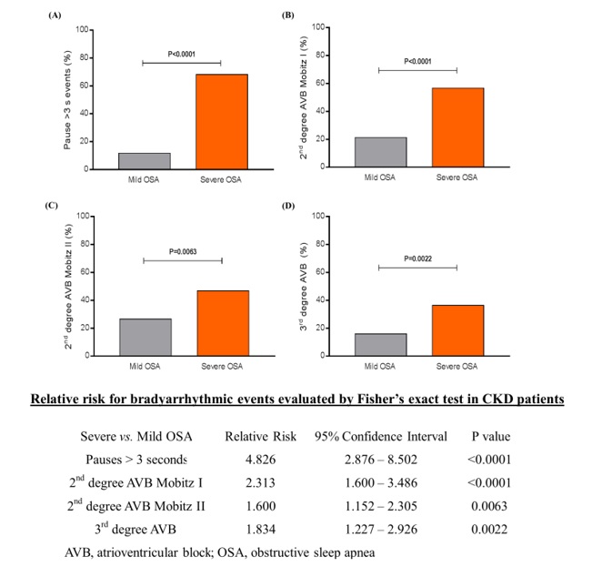 The general features of both groups are disposed of in Table 1. Analyzing the events of bradyarrhythmia recorded by the 24-hour-Holter monitoring, pauses >3 seconds, 2nd degree atrioventricular (AVB) Mobitz I, 2nd degree AVB Mobitz II, and 3rd degree AVB occurrence was much higher in the group with severe OSA (68.2%, 56.9%, 46.8%, and 36.4%, respectively) than in the group presenting mild OSA (11.7%, 21.3%, 26.6%, and 16.0%, respectively), P<0.0001, P<0.0001, P=0.0063, and P=0.0022, respectively, as shown in (Figure 1). The relative risk for bradyarrhythmic events in hypertensive CKD patients evaluated by Fisher’s exact test was presented in Figure 1. Our data showed that in patients with severe OSA, the risk of bradyarrhythmic events occurrence is significantly higher than in patients only with mild OSA.