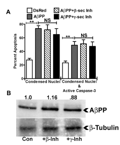 Figure 5. β- and γ- secretase inhibitors have no effect on HT22 cell apoptosis induced by AβPP. A) Quantitative assessment of HT22 cell apoptosis at 24 h post-transfection with DsRed2-empty vector, DsRed2-AβPP, DsRed2-AβPP treated with 250 nM β-secretase inhibitor, or DsRed2-AβPP treated with 500 nM γ-secretase inhibitor. Transfected cells were counted and scored as apoptotic as described in the legend to Figure 1B. Data are expressed as the mean ± SEM, n=3. ** indicates p<0.01 compared to DsRed2-control, NS=not significant, as determined using one-way ANOVA with a post hoc Tukey’s test. B) Western blot analysis of HT22 whole cell lysates after 24 h DsRed2 AβPP transfection Con or treated with β-secretase inhibitor (+β- Inh) or γ-secretase inhibitor (+γ-Inh). Top blot shows AβPP. Bottom blot shows β-tubulin loading control, n=3. Densitometry of AβPP band density normalized to β-tubulin band density is shown with the AβPP control being set to 1.0.