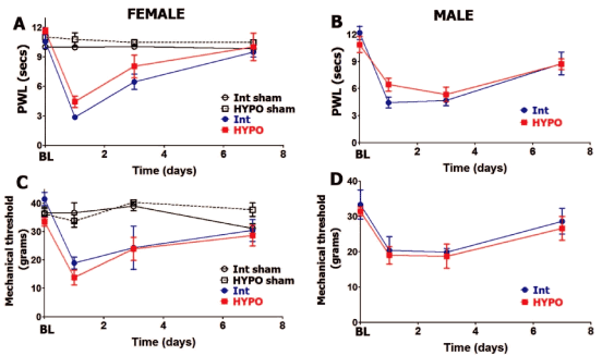 Figure 1: Hypophysectomy and postoperative hypersensitivity in female and male rats.