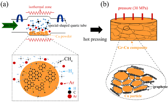 Figure 1. Schematic of fabrication process of Gr-Cu composites: (a) in-situ synthesis of Gr-Cu composite powders by RCVD, (b) fabrication of Gr-Cu bulk composites by vacuum hot pressing.
