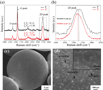 Figure 2. (a) Raman spectra and (b) peak 2D of P1 and P2, (c) SEM image of an isolated particle of P1, (d) the high magnification image of the powder surface (inset image is higher magnification). (In-situ synthesized Gr-Cu composite powders produced by RCVD with 1 and 4 sccm CH4 were designated as P1 and P2, respectively.)