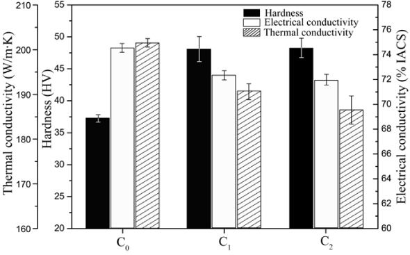 Figure 4. Measured hardness, electrical conductivity and thermal conductivity of C0, C1 and C2. (C0 was hot-pressed bulk pure Cu; C1 and C2 were hot-pressed 0.070 and 0.115 vol.% Gr-Cu bulk composites obtained from composite powders P1 and P2, respectively.)