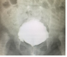 A 12 Fr umbilicus catheter was inserted by the ureter into the bladder like urinary drainage and ferulization for three weeks (Figure 4). The child was started on oral liquid feeds within 4 hours that had been suspended for an abdominal distended. The catheter was removed after ensuring that the patient and family could catheterize every 3 hours without difficulty previous a control cistograma (Figure 5 and Figure 6).