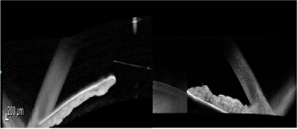 Figure 2: Anterior segment OCT demonstrating preop PAS and postop separation of the synechiae and widening of the anterior chamber angle following p-VSL.