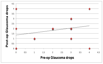 The mean number of glaucoma medication dropped from 2.08 ± 1.22 to 1.82 ± 1.09 (p>0.05), with a positive correlation between pre-op and post-op eye drops (r=0.27) (Figure 6-8).