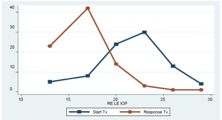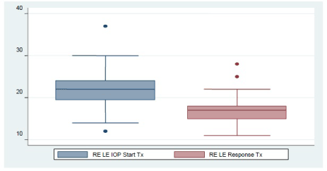 Baseline IOP: 21.84 mmHg SD: ± 2.73 àIOP with treatment: 17.77 SD: ± 3.11.