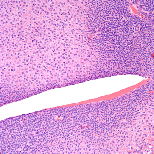 Figure 2. Uniform small round blue tumor cells with minimal cytoplasm are seen at the periphery of the nodules transitioning to central areas with more abundant pale eosinophilic cytoplasm (H&E stain, 40x magnification).