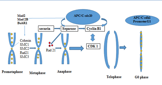 Anaphase Promoting Complex /cyclosome (APC/C) is a highly complex protein initially identified more than 15 years ago, a E3 ubiquitin ligase, that has 13 subunits, which triggers the metaphase to anaphase transition by marking select proteins by polyubiquitin chains for degradation. The APC/C requires the binding of a cofactor, Cdc20 or Cdh1, in order to select substrates and perform its activity [34]. APC/C has substrates that regulate the mitotic checkpoint (MCC) and chromosome segregation. They must be degraded for cells to exit mitosis (Figure 1). Securin is a protein that inhibits separase, which in turn inhibits cohesin, a protein that holds sister chromatids together. Therefore, in order for anaphase to progress, securin must be inhibited so that cohesin can be cleaved by separase. Separase activated cleaves Scc 1 or RAD 21 subunit of the multi protein complex cohesin that holds sister chromatides together (Figure 1) [35]. The anaphase-promoting complex (APC) is tethered to cohesion in processes of chromosome segregation and separation in mitotic cells and new data show functional activity in post-mitotic neurons in which alterations of these proteins may lead to aneuploidy and increased proteotoxicity [29,30,36-40].