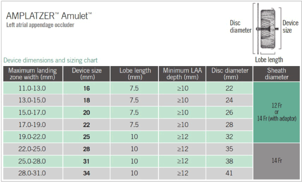 figure 2. Device Dimension and Sizing Chart for AMPLATZER Amulet Device [19].