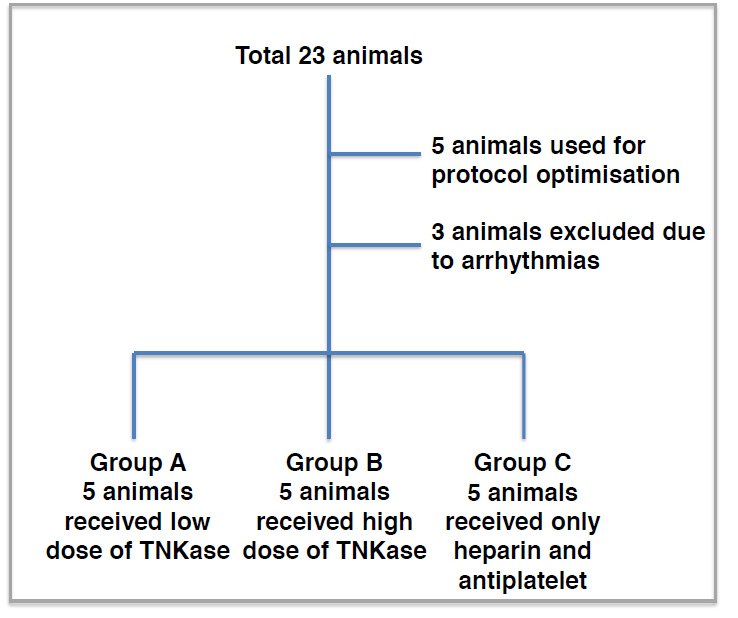 Post successful thrombosis of the vessels animals were allocated to low-dose (Group A) of intravenous tenecteplase (TNK-ase; purchased by Boehringer Ingelheim) slowly administered over 4-5 min through jugular vein catheter, or high dose (Group B) or saline.