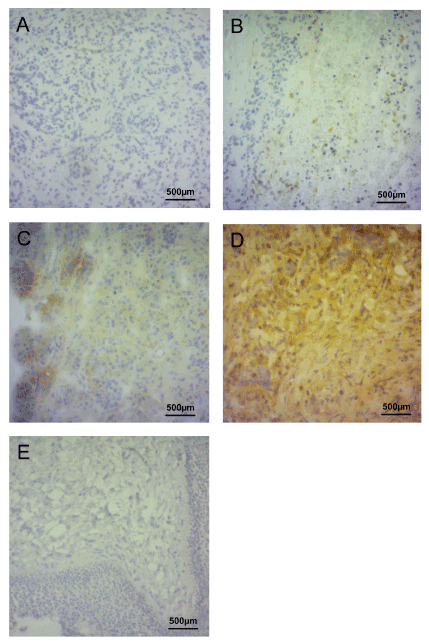Figures 1A to 1D show, negative (A), weak (B), moderate (C) and strong immunohistochemical staining of LOXL-4 in pancreatic cancer specimens. Figure 1 E shows benign oral mucosa specimen serving as negative control. Magnification of all images was 200.