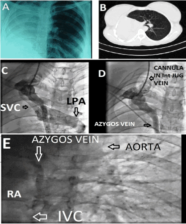 Figure 5. Post operative photographs on the 4th year: (A) chest X Ray showing opacity in the right hemithorax with dextroposed heart. (B) Showing the CT scan confirming the findings of Chest X Ray with hyperinflated left lung. (C) Shows passage of radio opaque dye on right internal jugular venous angiography into both left pulmonary artery (lower arrow head) and the azygous vein. Upper arrow shows the outline of the right internal jugular vein. (D) Shows further passage of dye through the azygous vein (horizontal arrow) after the flow through the left pulmonary artery stopped. (E) shows mild opacification of the right atrium at a later phase due to retrograde passage of dye through the azygos vein.(redrawn from Dasbaksi et al. [11], JTCVS, 2014 with permission)