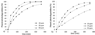Figure 1. Phenol photodegradation % vs. time at different starting concentrations (15, 25 and 50 ppm respectively): a) TiO2 P25; b) TiO2 Kronos 1077.